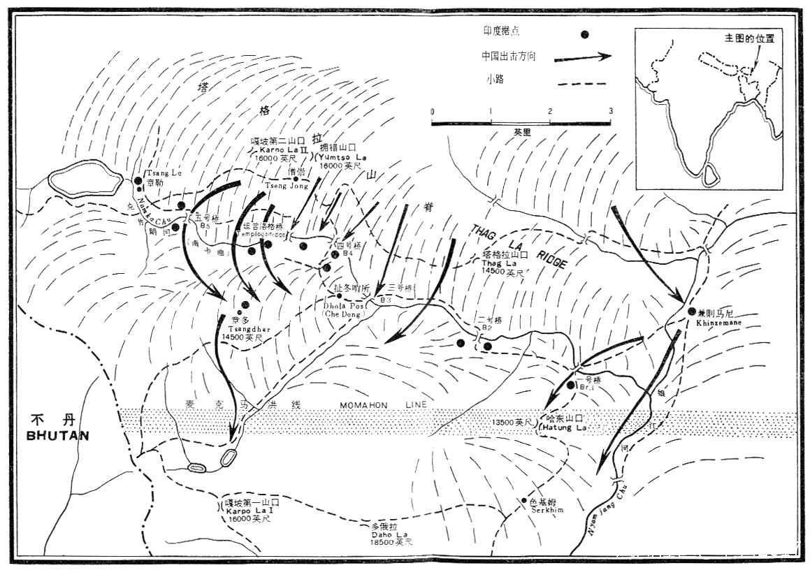 中國部隊已展開三路攻勢。擊潰了印軍第七旅的中國部隊,兵力估計約三個團,轉向東南,經過薩客地(Shakti),於十月二十三日到達距達旺不到十英里的盧姆拉(Lumla);這一支部隊已經同經過兼則馬尼、沿娘江河(Nyamjang Chu)而下的第二路部隊匯合。