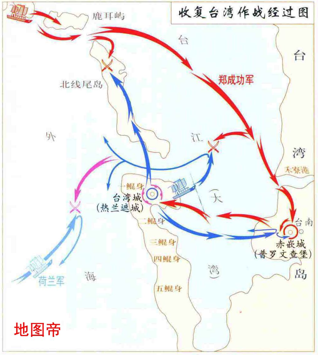 1661年,荷蘭主力軍返回巴達維亞(今印度尼西亞雅加達),而進攻廈門的清軍主力也返回京師(今北京)。鄭成功抓住此千載難逢的時機,率兩萬多人的艦隊作為主力,由金門料羅灣(金門島東南部的海灣)先行出發,後續還有六千多人的後備部隊跟進。當時駐守台灣的荷蘭軍兵力為兩千多人,主力駐守在熱蘭遮城(台灣城,今台灣省台南西安平),少量兵力駐守台江對岸的普羅文查堡(赤嵌城,今台灣省台南市)。