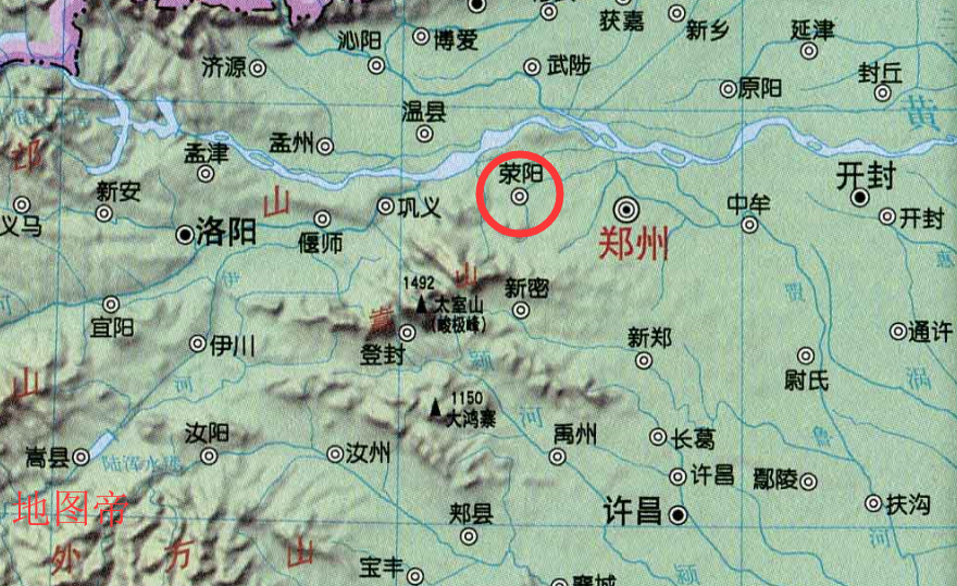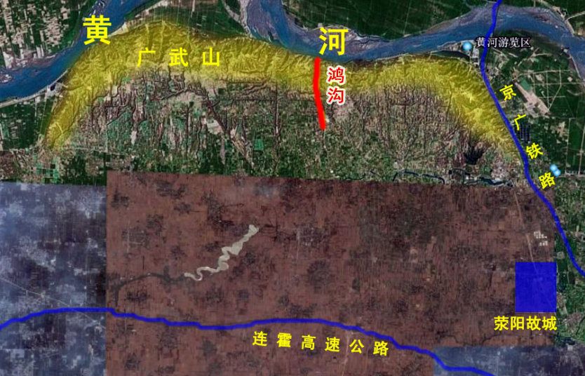 鴻溝在哪呢?現在河南省滎陽市廣武山,北邊就是滔滔黃河。寬約300米的鴻溝是當時楚漢兩軍作戰的主戰場之一,經常在這裏附近廝打。所以,楚漢劃界時,自然就要鴻溝為界。