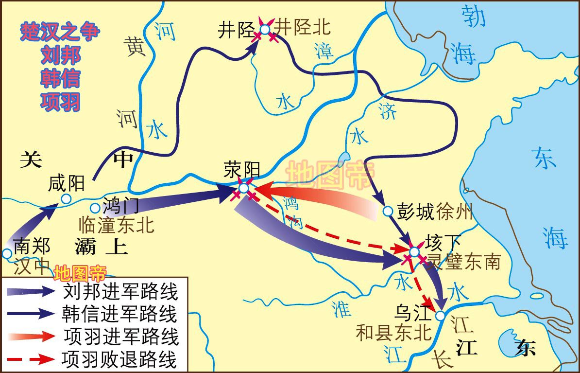 劉邦不會給項羽反撲的機會,兵分兩路。一路與楚軍相持,一面讓韓信抄楚軍後路,佔領河北、山東一帶。形勢已朝着有利於劉邦的方向發展,再加上蕭何經營關中得法,為前線源源不斷的運輸來兵員和糧餉。再看看項羽,人困馬乏,糧草也快吃光了,沒有補給,危機四伏。楚軍與漢軍相爭沒有失敗過,但這次實在是撐不住了。