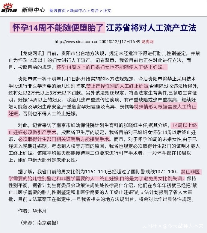 但14周後墮胎,“必須取得計生部門相關證明後方能接受手術”,為什麼?因為14周後通過技術手段可以清楚的鑑定出胎兒性別,所以這項規定的目的是為了禁止選擇性別人工終止妊娠,這是在保障不同性別的胎兒作為生命個體享有平等的出生權。從本質上,這種政策就是在保護女嬰,卻被田園女拳顛倒黑白抹黑成“中國婦女早已失去了墮胎權利”。