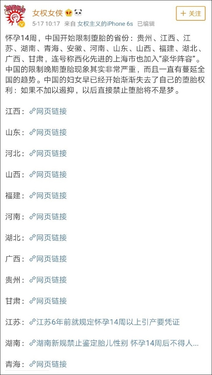 懷孕14周,中國開始限制墮胎的省份:貴州、江西、江蘇、湖南、青海、安徽、河南、山東、山西、福建、湖北、廣西、甘肅,連號稱西化先進的上海市也加入“豪華陣容”。中國的限制晚期墮胎現象其實非常嚴重,而且一直有蔓延全國的趨勢。中國的婦女早已經開始漸漸失去了自己的墮胎權利:如果不加以遏抑,以後直接禁止墮胎將不是夢。