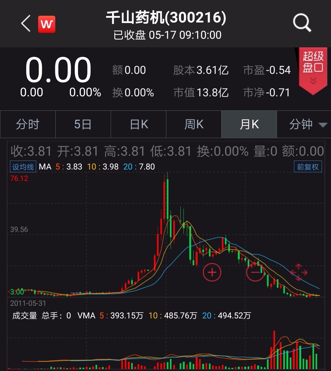 昔日股價一度高達109元(未復權)的明星股千山藥機,如今股價被暫時定格在了3.81元,隨之被埋的還有逾4萬股民。