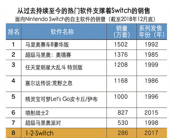 不過,自主軟件的熱門排行榜前列大多數仍是從過去持續至今的“經典”系列。推出新方案的Nintendo Labo和通過揮舞手臂來戰鬥的格鬥遊戲《ARMS》等遊戲增長乏力。