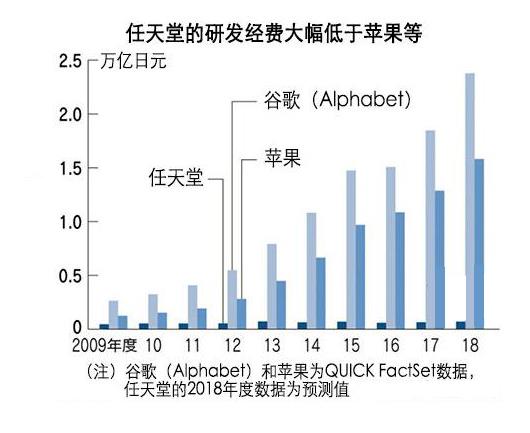 這些IT行業大型企業的資金實力遙遙領先於任天堂。谷歌母公司Alphabet最近的年均研發費用達到214.2億美元(約合2.3776萬億日元,QUICK FactSet數據),而蘋果為142.4億美元(約合1.5806萬億日元,同上)。另一方面,任天堂的研發費用僅為700億日元(2018財年預期)。任天堂的一把手錶示,“必須比以往更加努力,否則我們的地位也並非堅如磐石”,危機感越來越強。