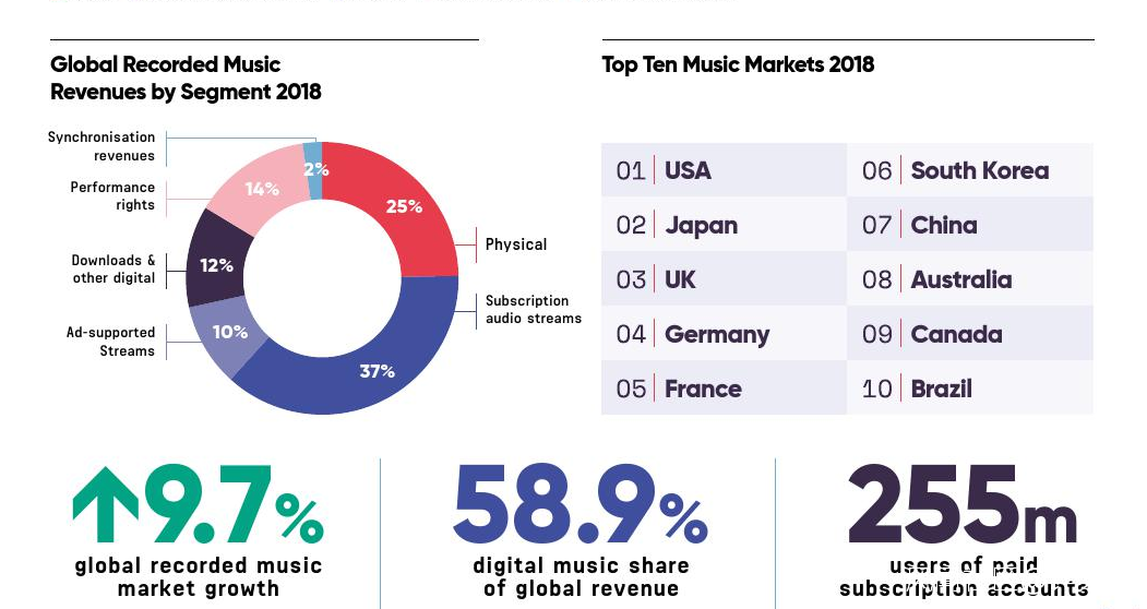 4月2日,國際唱片協會IFPI發佈了《全球音樂報告2019》。報告顯示,2018年受付費訂閲流媒體增長32.9%的推動,流媒體整體收入增長了34.0%,佔全球收入的近一半(47%)。 截至2018年底,付費流媒體服務用户數達2.55億,付費流媒體收入佔錄製音樂總收入的37%。其中,中國則繼2017年首次躋身全球前十大音樂市場後,在2018年排名上升至第7位。