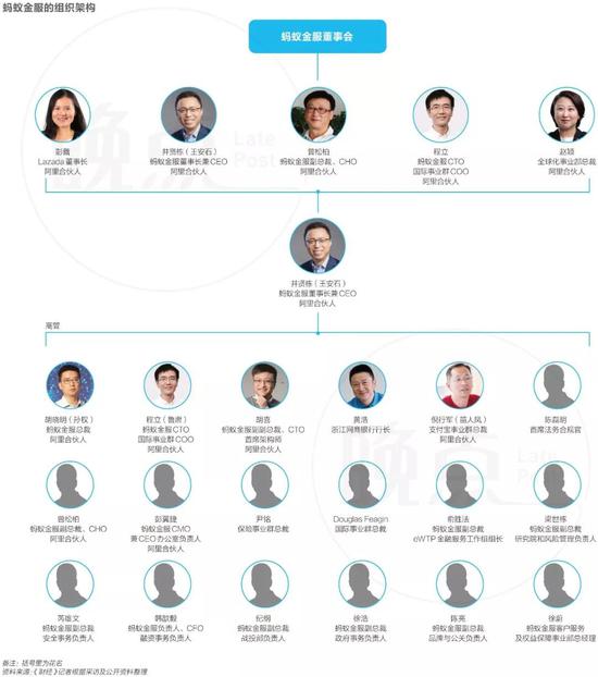 螞蟻金服董事會目前共有5人,包括阿里元老&現任Lazada董事長彭蕾、螞蟻金服董事長兼CEO井賢棟(王安石)、螞蟻金服副總裁&CHO曾松柏、螞蟻金服CTO&國際事業羣COO程立、阿里全球化事業部總裁趙穎。