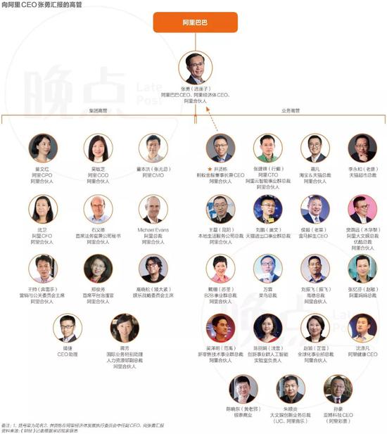 具體業務層面,有近20人向張勇彙報,涵蓋了阿里每一個重要業務板塊,包括:淘寶&天貓總裁蔣凡、天貓超市總裁李永和(老鼎)、天貓進出口事業羣總裁劉鵬(奧文)、盒馬鮮生CEO侯毅(老菜)、本地生活服務公司總裁王磊(昆陽)、CTO&阿里雲智能事業羣總裁張建鋒(行癲)、阿里大文娛總裁&優酷總裁樊路遠(木華黎)、大文娛創新業務總裁朱順炎、B2B事業羣總裁戴珊(蘇荃)、菜鳥總裁萬霖、高德總裁劉振飛(振飛)、阿里媽媽總裁張憶芬(趙敏)、新零售技術事業羣總裁吳澤明(範禹)、創新事業羣人工智能實驗室負責人陳麗娟(淺雪)、全球化事業部總裁趙穎(芷雪)、阿里健康CEO沈滌凡、銀泰商業CEO陳曉東(黃老邪)、亞博科技CEO孫豪等人。