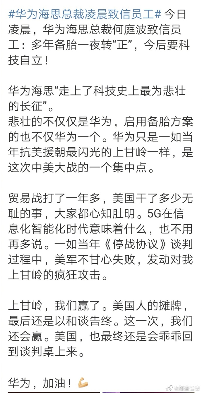 而華為海思也發佈了致員工的一封信: 前路更為艱辛,我們將以勇氣、智慧和毅力,在極限施壓下挺直脊樑,奮力前行!滔天巨浪方顯英雄本色,艱難困苦鑄造諾亞方舟。