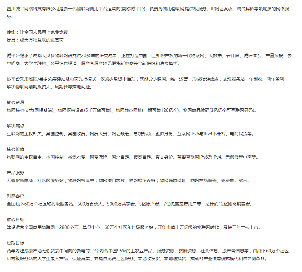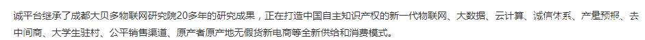 誠平台繼承了成都大貝多物聯網研究院20多年的研究成果,正在打造中國自主知識產權的新一代物聯網、大數據、雲計算、誠信體系、產量預報、去中間商、大學生駐村、公平銷售渠道、原產者原產地無假貨新電商等全新供給和消費模式。