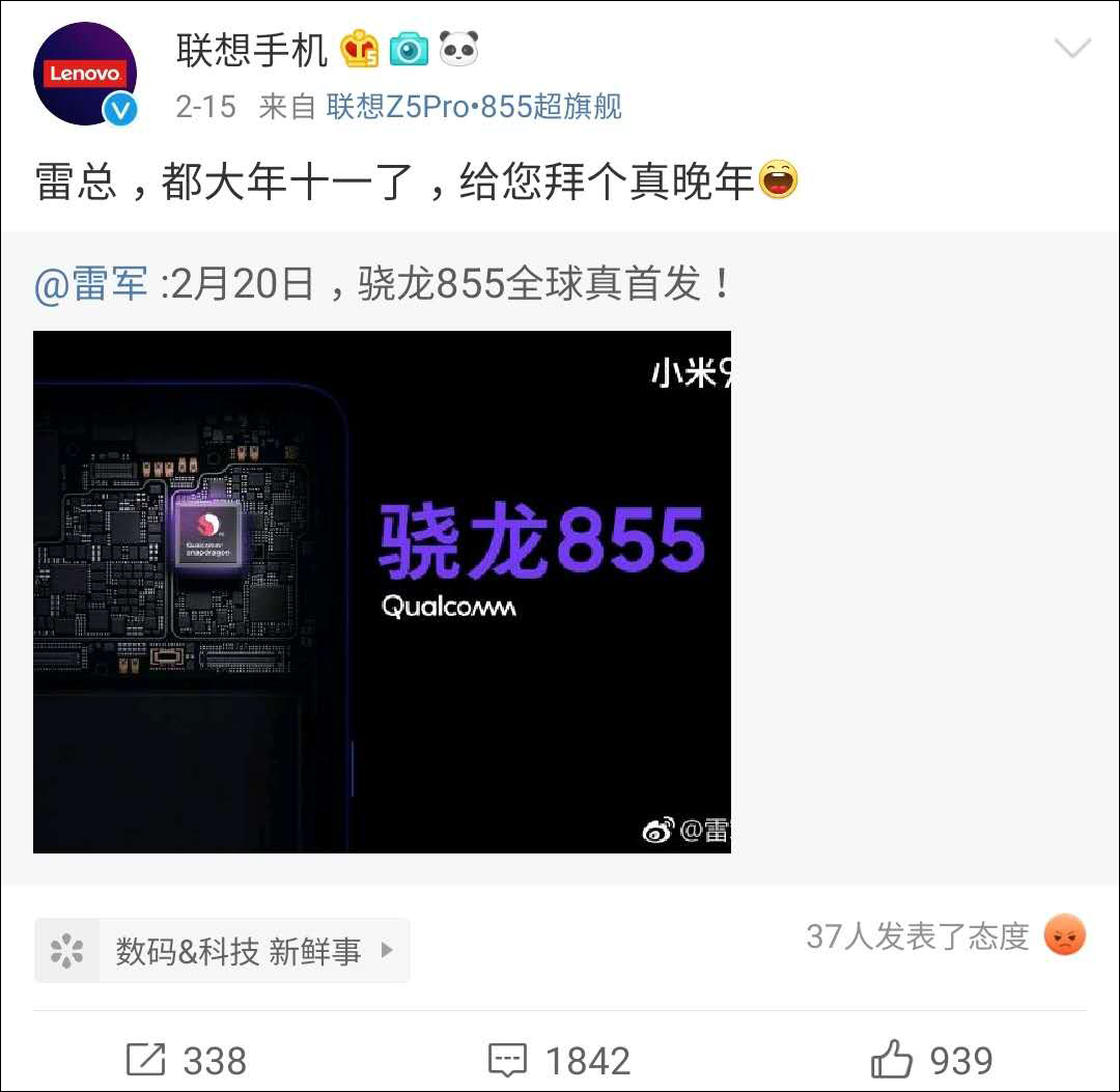 這一説法也遭到了@聯想手機 的嘲諷,在@聯想手機 轉發雷軍的一條微博中,@聯想手機 這樣調侃道:“雷總,都大年十一了,給您拜個真晚年。”