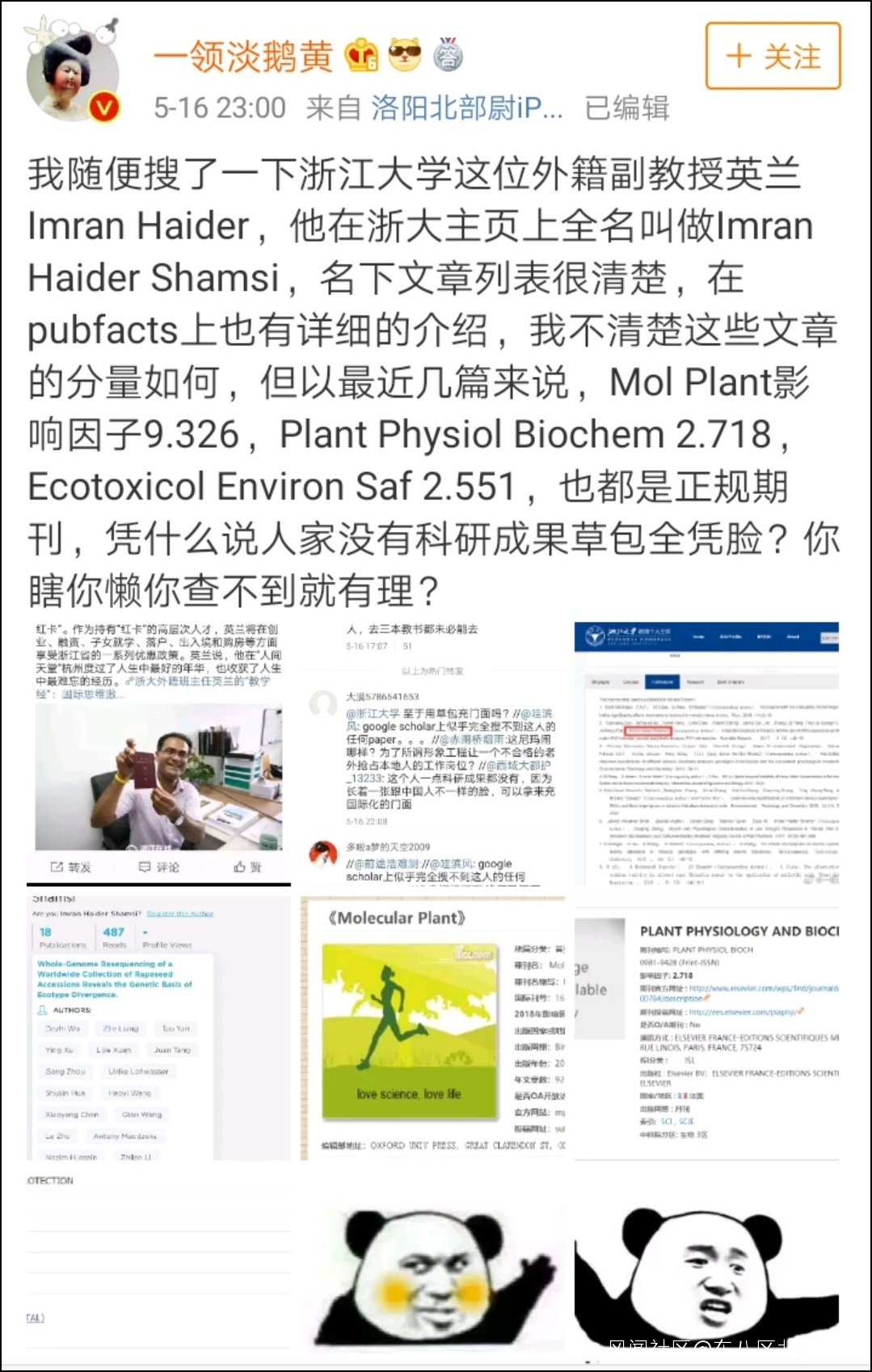 網友@一領淡鵝黃 查詢後發文稱,英蘭最近的幾篇論文,Mol Plant影響因子9.326,Plant Physiol Biochem 2.718,Ecotoxicol Environ Saf 2.551……