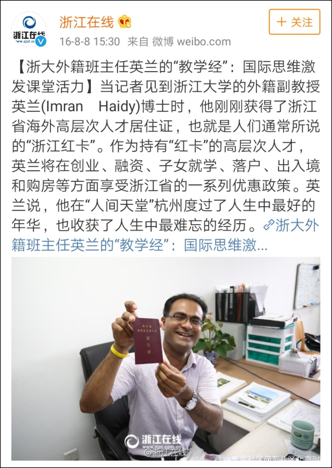 2016年,浙江在線報道了一則浙大外籍副教授英蘭(Imran Haidy)獲得浙江省海外高層次人才居住證的新聞。此事在當年並未引起關注,直到日前有博主轉發舊聞並質疑,這個所謂的外籍副教授毫無科研成果,含金量不高,完全是浙大為了國際排名引進充當門面用的。