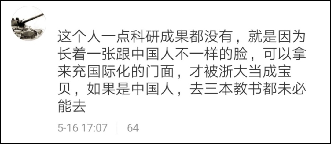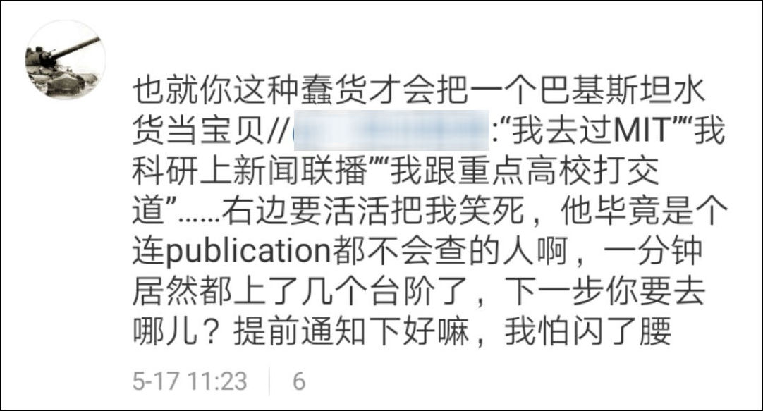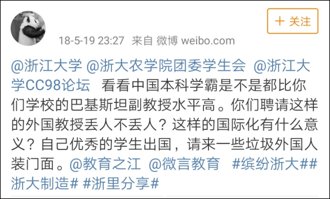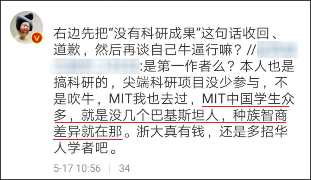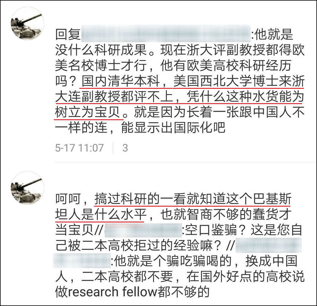 在質疑的博主看來,“搞過科研的一看就知道這個巴基斯坦人是什麼水平”,“MIT中國學生眾多,就沒幾個巴基斯坦人,種族智商差異就在那”,“國內清華本科,美國西北大學博士來浙大連副教授都評不上,憑什麼這種水貨能樹立為寶貝”。