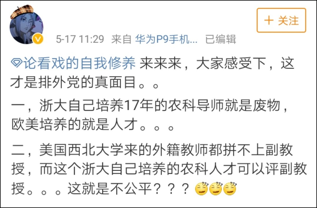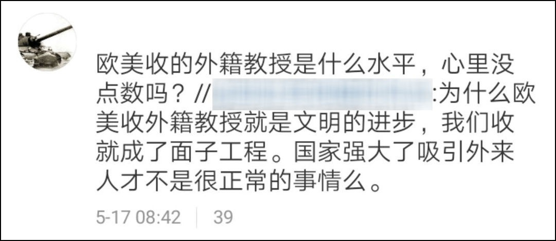 當其他網友詢問最早提出質疑的那位博主,“為什麼歐美收外籍教授就是文明的進步,我們收就成了面子工程”時,他給出的經典回答是:“歐美收的外籍教授是什麼水平,心裏沒點數嗎?”
