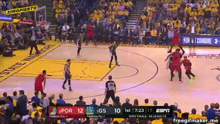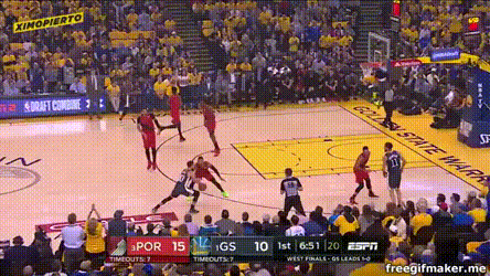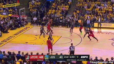 於是雙方彼此消磨了會兒,誰也奈何不了誰。到第四節,利拉德的庫裏模仿秀又開始:連續射中三分,吸引勇士夾擊;然後: