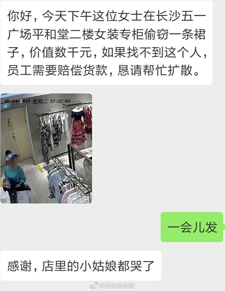 5月14日晚,長沙一自媒體發佈網友爆料,在雙方對話截圖中,爆料網友稱,一名女子在平和堂商場2樓一門店偷竊,員工可能面臨賠償貨款。爆料網友同時發佈了三張監控截圖。
