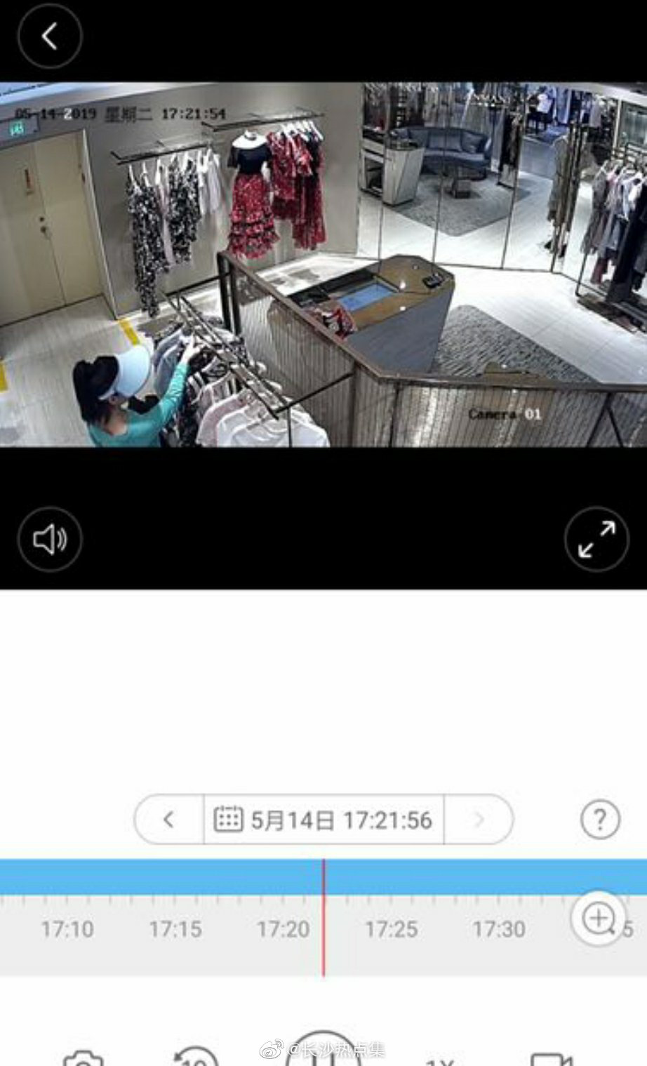 5月16日,有知情人士向記者提供了完整的監控視頻,監控內容顯示,5月14日5點21分左右,藍衣女子走進門店監控畫面中,女子先是在一排衣架附近徘徊,然後拿起衣架上一條黑白碎花裙,迅速將裙子扯下,揉作一團,然後用原先搭在手肘上的衣服作為遮擋,將黑白裙子塞入白色手提袋中,隨後慢悠悠走出監控區域,整個過程持續不到20秒。