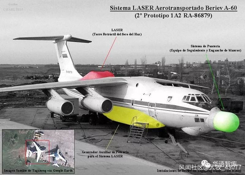 1981年8月,第一架“激光飛機”A-60騰空而起,翱翔於蘇聯領空。它是在伊爾-76基礎上設計改裝而成。機頭前方安裝了制導系統的特別整流罩,機身兩側為渦輪電機。機艙上方開了一扇門,激光炮伸出門外移動。據數據測算,A-60能擊落大量空中目標。