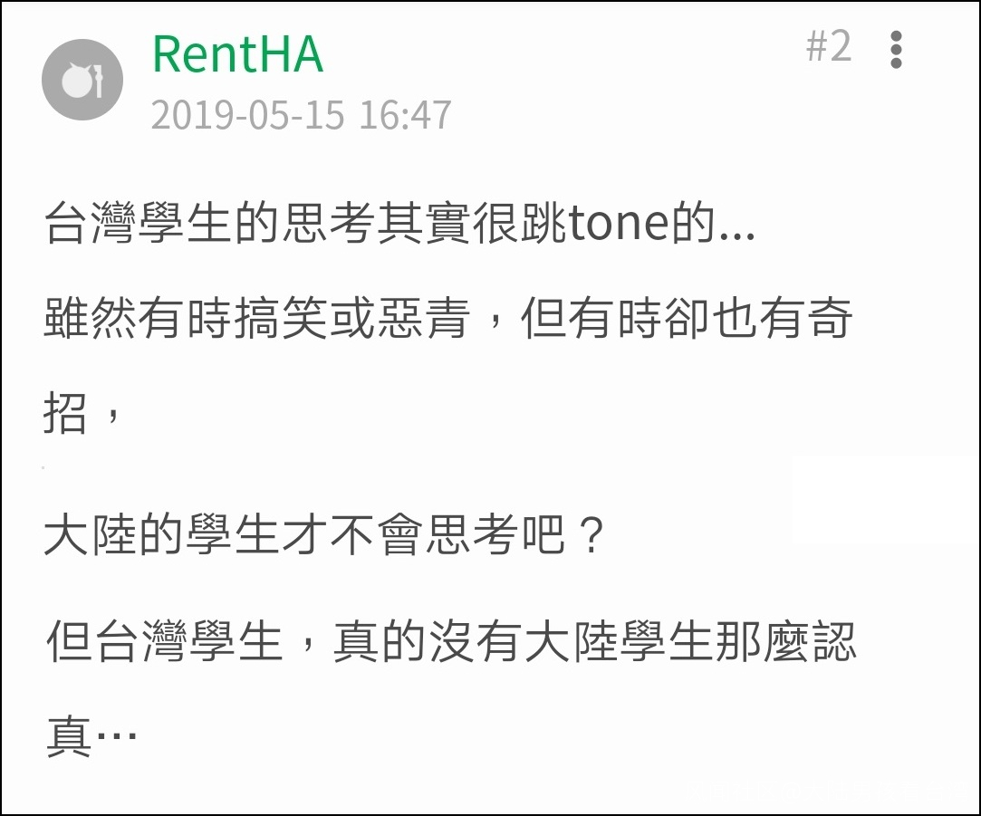 樓主想跟大家分享這一篇文章,源於一篇三年前的舊文最近在島內論壇上又火了。其實先動手的是大陸網友,到島內論壇上放文章挑事,隨後有台灣網民加入討論兩岸學生獨立思考能力等議題。挑選部分評論如下↓↓,過激的就不放出來了,放出來會被刪文的。