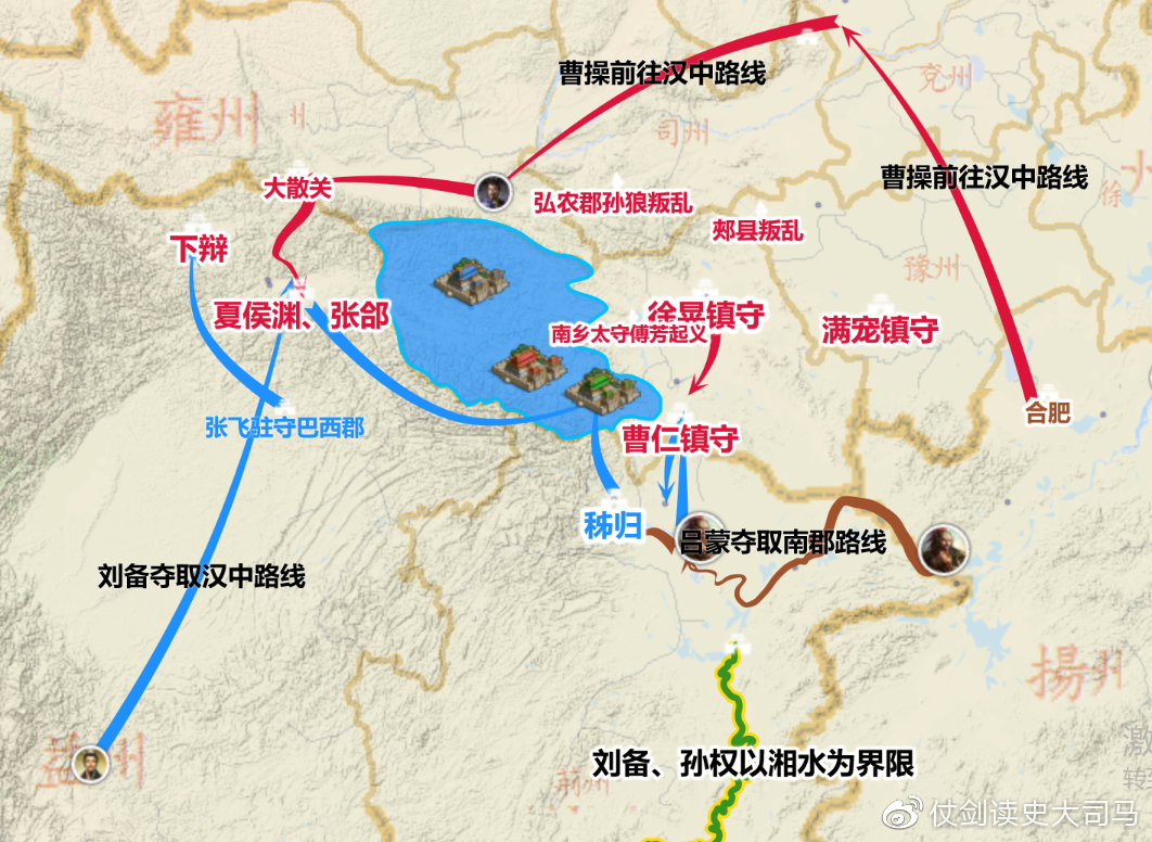 曹操大軍出兵漢中討伐張魯,夏侯淵率涼州諸將與曹操會師於休亭。漢中平定後,曹操正式拜夏侯淵於徵西將軍,鎮守漢中。此時,曹魏集團東、南、西三大戰區正式部署完畢,東線由夏侯惇任總司令,南線由曹仁任總司令,西線由夏侯淵任總司令,三位司令都有“假節”,都督戰區內各大將,夏侯淵也在登上人生巔峯。