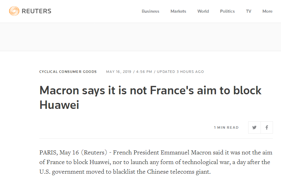 馬克龍週四參加了在巴黎舉行的“VivaTech”活動。他在活動上説:“我們的態度不是封殺華為或其他任何公司,而是要維護國家安全及歐洲主權。但我認為,現在發動一場科技戰或貿易戰……是不恰當的。”