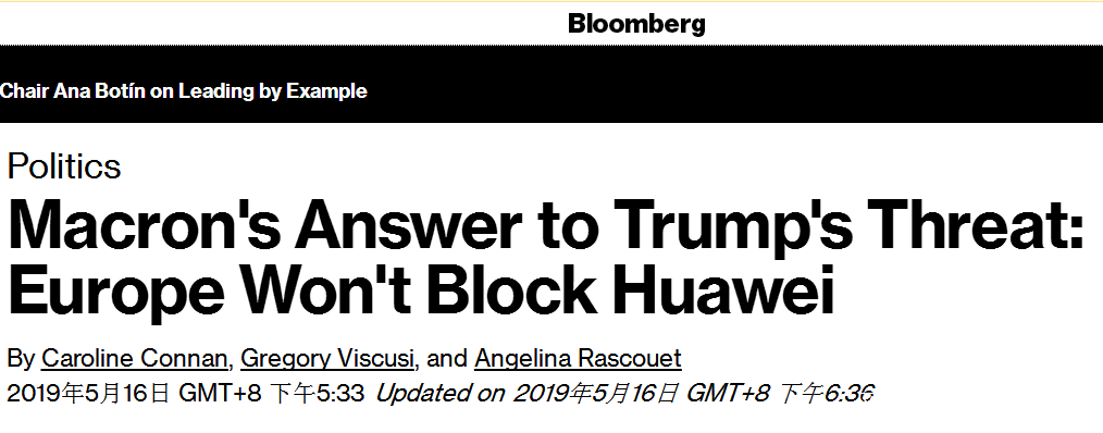 彭博社16日題為“馬克龍對特朗普威脅的回答:歐洲不會封殺華為 ”的報道