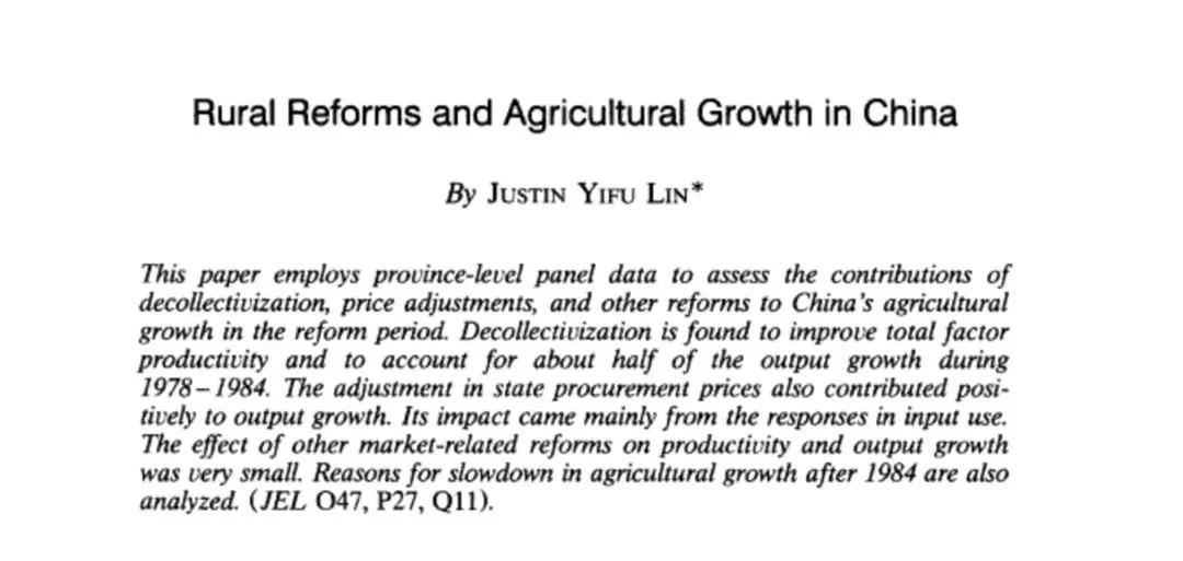 林毅夫著名的論文“中國的農村改革與農業增長”,1992年3月刊載於《美國經濟評論》