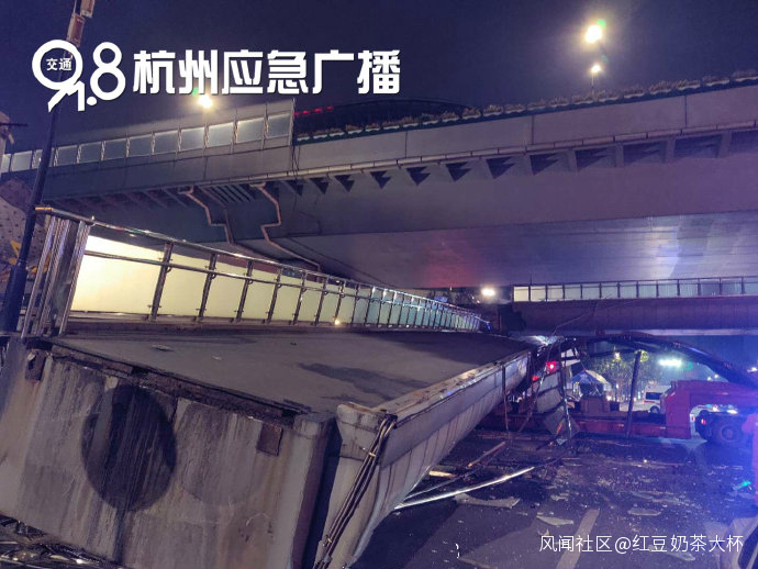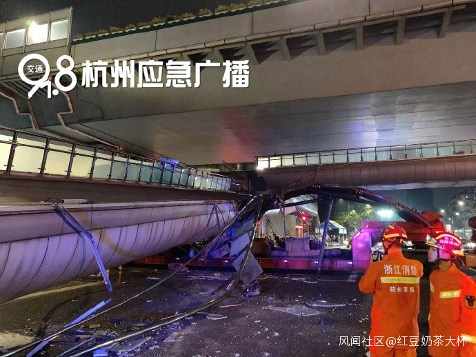 另據@杭州交通918 消息,今晚22:40左右,開吧用户報料:慶春路秋濤路口天橋被一輛超高貨車撞擊,半邊人行天橋幾乎被扯了下來!目前,消防江干大隊景芳中隊已到達現場進行救援,暫時沒有人員傷亡消息。杭州交通91.8應急廣播將為您持續關注!