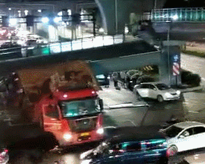 有網友稱,天橋是被超高的大貨車給撞塌的。據目擊者拍到的視頻顯示,天橋先後有兩輛大型車輛經過,第一輛經過時已經蹭到了橋面,第二輛經過時,車頂徹底撞到天橋,使天橋瞬間坍塌。