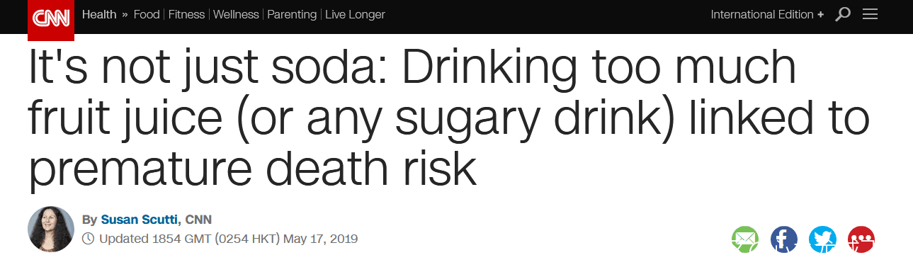據美國有線電視新聞網(CNN)報道,一項於17日發表在《美國醫學會雜誌•網絡開放》(JAMA Network Open)上的新研究表明:過量飲用果汁等“含糖飲料”可能會增加早死幾率。研究稱,尤其是飲用過量果汁,會將早死幾率增加9%至42%。