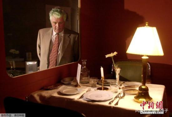 資料圖:英國推理小説家阿加莎⋅克里斯蒂的孫子在參觀“東方快車”餐車的模型。