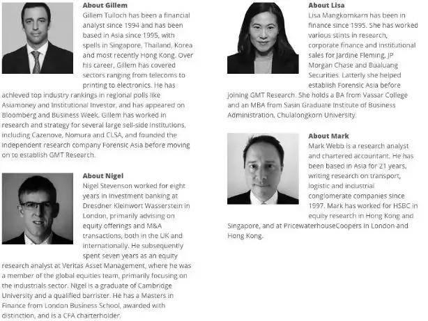 更為諷刺的是,這次做出沽空報告的GMT Research的幾位大神大多是歐美面孔:創始人Gillem Tulloch是前野村和里昂證券分析員,特許金融分析師Nigel Stevenson畢業於英國劍橋大學,另一位分析師Mark Webb此前也供職於倫敦。