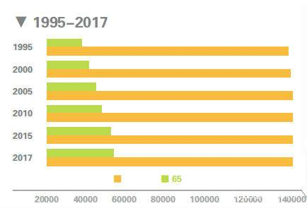 數據顯示,2017年日本70歲以上人口增長100萬達到了2618萬,為總人口的20.7%,65歲以上人口達到了總人口的28.1%。其中有807萬65歲以上的高齡者仍在工作中,創歷史紀錄。而按照世界衞生組織的標準,一個國家65歲以上人口占總人口的比重達到7%,就意味着該國進入“老齡化”社會。超過20%的日本,無疑成為“超老齡社會”。