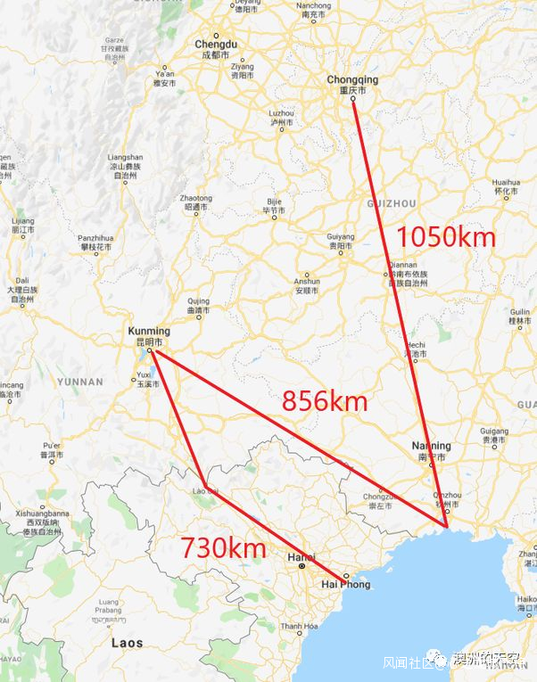 從上圖可以看出,省會南寧最大的尷尬是,儘管南寧距離南部海岸只有100公里,但船隻必須向東行駛1000公里才能到達大海。想象一下廣西人民為國際貨運增加的額外費用!