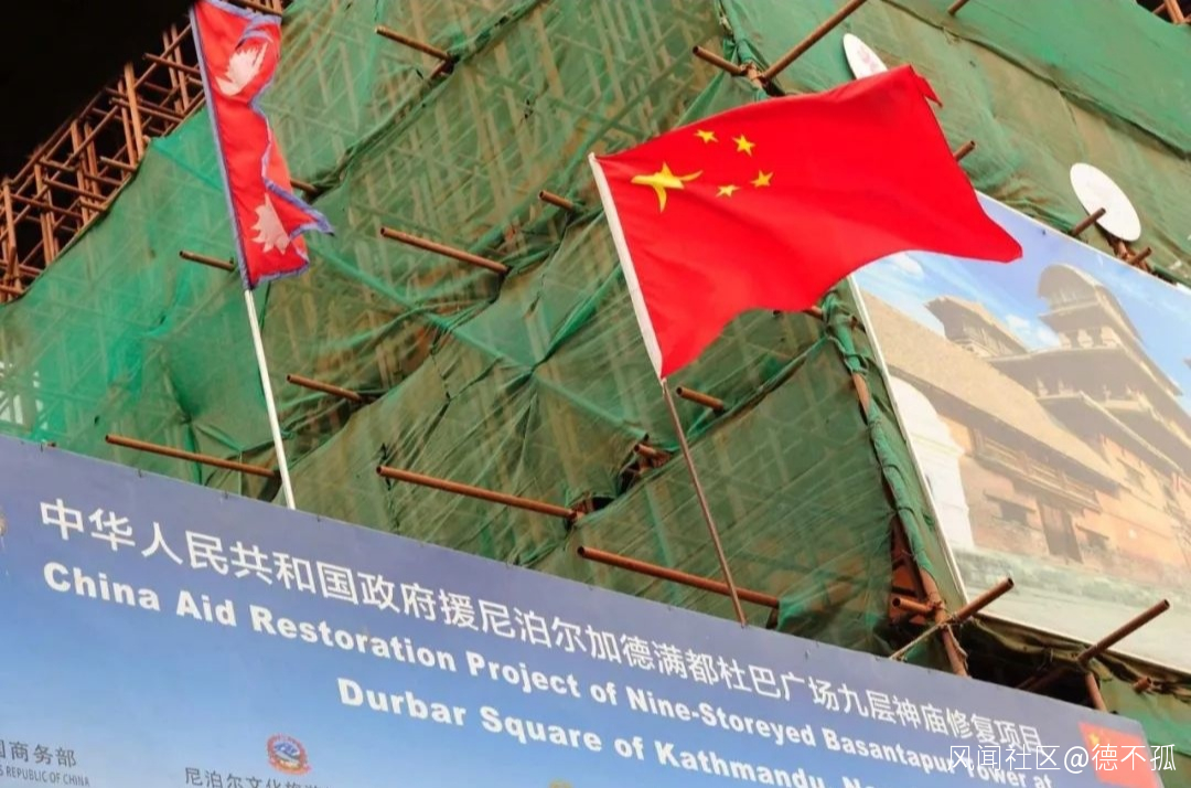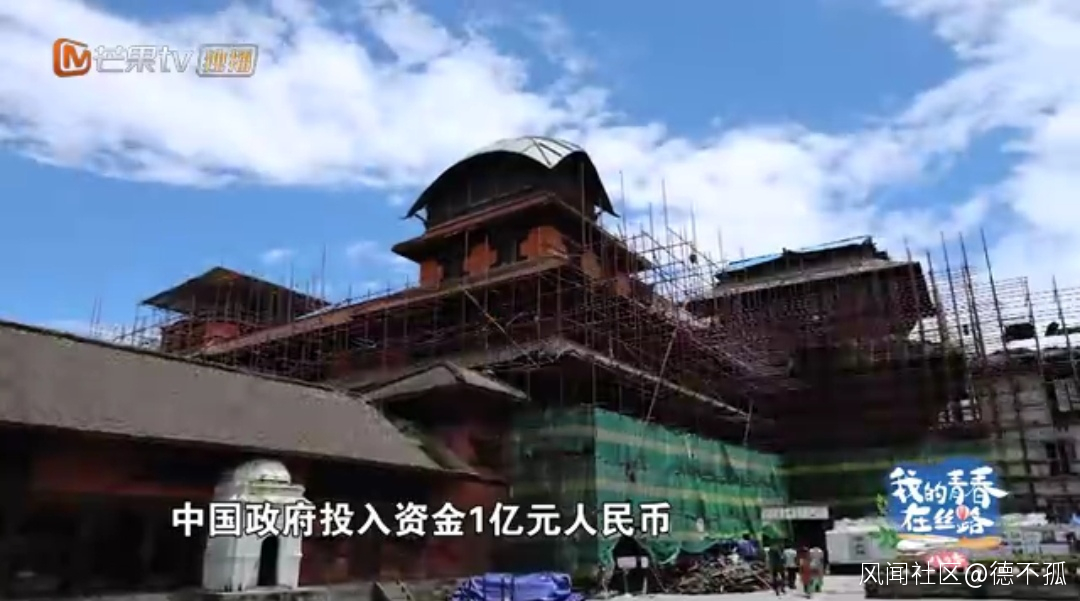 站在尼泊爾首都加德滿都杜巴廣場的入口,腳手架和防護網已經遮住大部分古建築,遊客們小心翼翼地穿行其間。而只要經過九層神廟,遠遠就能看見一個懸掛的圓牌上寫着四個大字:中國援建。