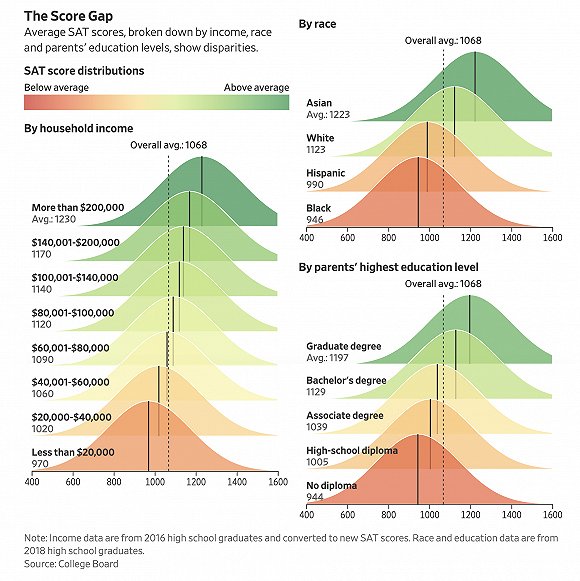 素有“美國高考”之稱的SAT一直都被批評展現的是學生的“財力”,而非學術能力。《華爾街日報》指出,白人學生的SAT分數平均比拉美裔及非裔學生高出133分與177分,父母收入超過20萬美元的學生,也比家庭收入在6萬美元(美國家庭收入中位數)以下的學生高出約170分。