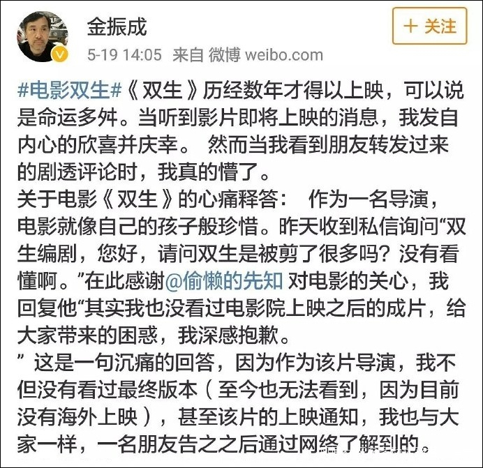 作為一名導演,電影就像自己的孩子般珍惜。昨天收到私信詢問“雙生編劇,您好,請問雙生是被剪了很多嗎?沒有看懂啊。”在此感謝@偷懶的先知 對電影的關心,我回復他“其實我也沒看過電影院上映之後的成片,給大家帶來的困惑,我深感抱歉。”