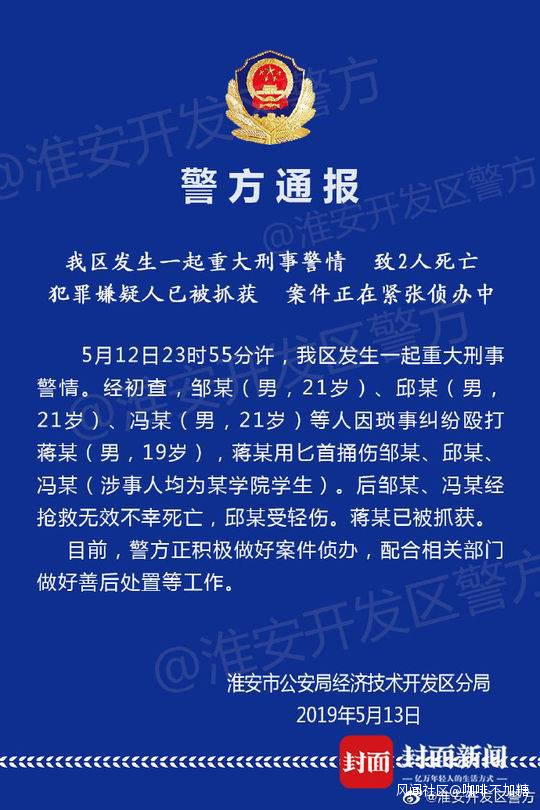 5月13日,江蘇省淮安市公安局經濟技術開發區分局發佈官方通報:“5月12日23時55分許,我區發生一起重大刑事警情。經初查,鄒某(男,21歲)、邱某(男,21歲)、馮某(男,21歲)等人因瑣事糾紛毆打蔣某(男,19歲),蔣某用匕首捅傷鄒某、馮某、邱某。後鄒某、馮某經搶救無效不幸死亡,邱某受輕傷。蔣某已被抓獲。目前,警方正積極做好案件偵辦,配合相關部門做好善後處置等工作。”