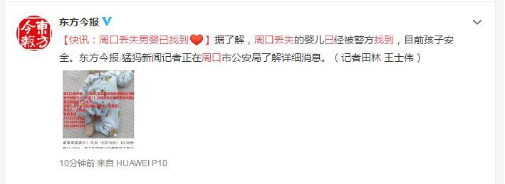 據瞭解,周口丟失的嬰兒已經被警方找到,目前孩子安全。東方今報.猛獁新聞記者正在周口市公安局瞭解詳細消息。(記者田林 王士偉)