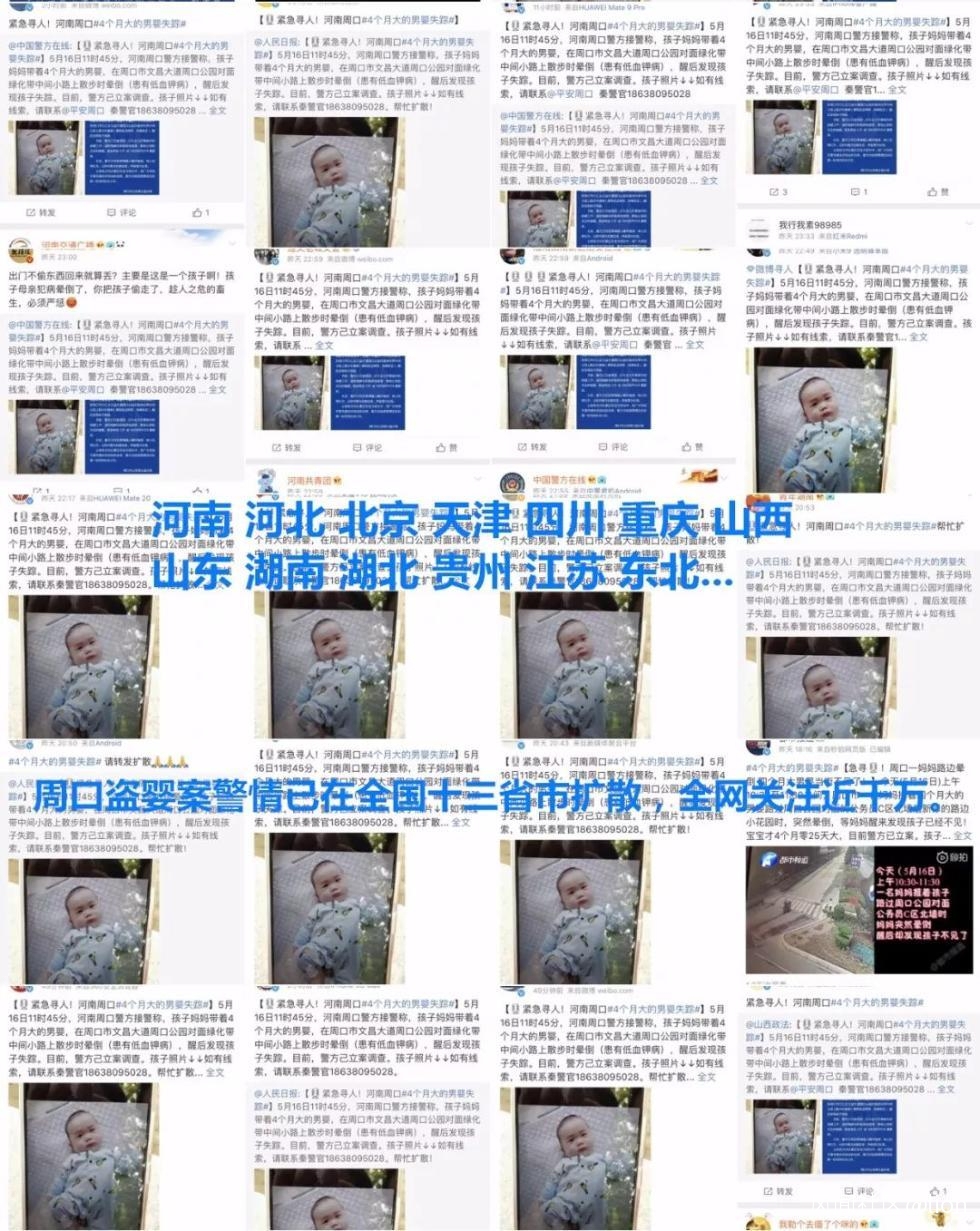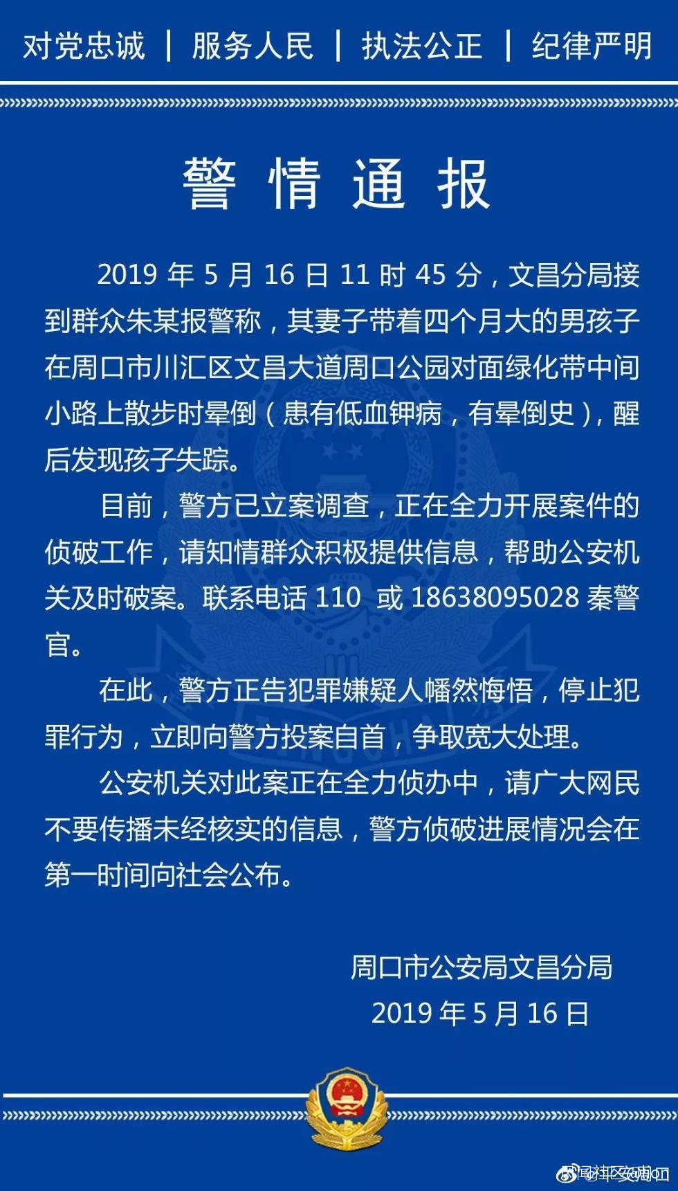 【最新官方消息:丟失的周口男嬰已成功追回,並於今日凌晨平安抵達周口】據官方消息:5月16日男嬰被盜案發生後,周口警方迅速成立專案組,抽調精幹警力攻堅克難,開展案件偵破工作。通過調取視頻監控、大量走訪羣眾、提取物證勘驗等措施,歷經60多個小時奮戰後,最終在鄭州境內將男嬰成功追回。
