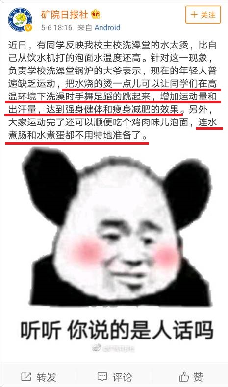當面對同學們浴室水太燙的控訴是,他説這是為了讓大家手舞足蹈的跳起來,增加運動量。