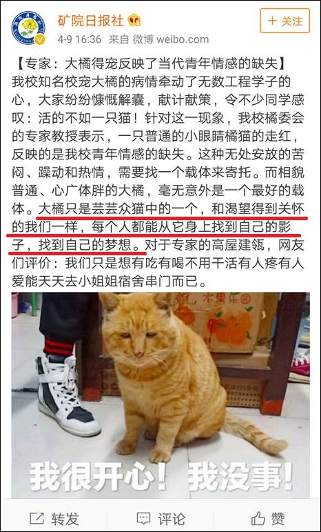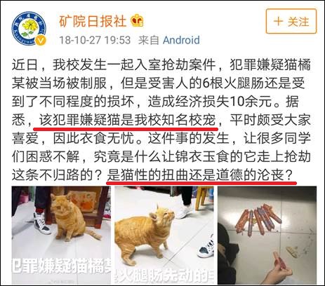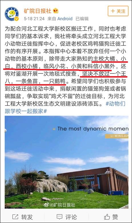 該校@礦院日報社發微博稱:“為配合河北工程大學新校區搬遷工作,同時也考慮同學們的基本訴求,我社將牽頭成立河北工程大學小動物遷徙指揮中心,促進老校區雞鴨貓狗遷徙工作的有序開展。本指揮中心本着不放棄任何一個小動物的基本原則,除帶走大家熟知的主校大橘、小白,西校小橘,臨風小花、小黃和科信小黑外,還將對鑑湖開展一次地毯式搜查,**堅決不放過一個王八,一條魚苗,一隻鵝鴨。**希望同學們也積極參與到這場遷徙活動中來,捐獻閒置的貓籠狗籠或者鍋碗瓢盆,爭取實現“雞犬不留”的遷徙目標,為河北工程大學新校區生態文明建設添磚添瓦。”