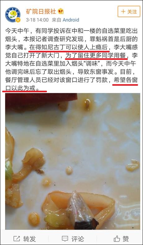 食堂裏吃出了煙頭,他也能用調侃的語氣平息大家的怒火——當然最主要還是涉事窗口已經得到了懲罰。
