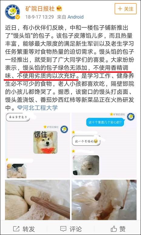 對於包子裏餡兒少,他説這是饅頭餡兒的包子,綠色無添加,不使用香精調料、不使用劣質肉以次充好。而且隔壁邯院的小孩兒都饞哭了!