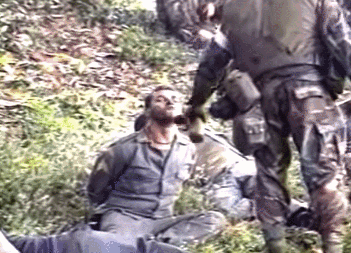 ▲被美軍捆綁起來囚在路邊的****俘虜
