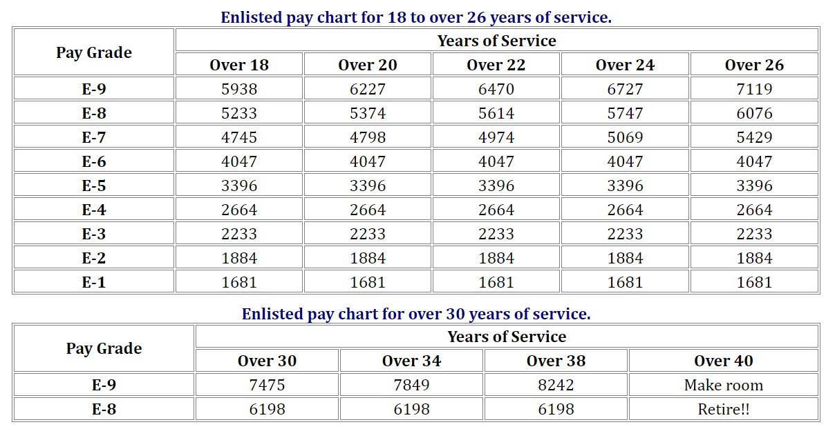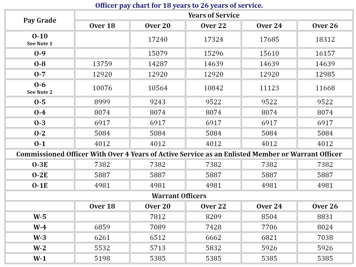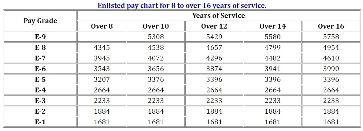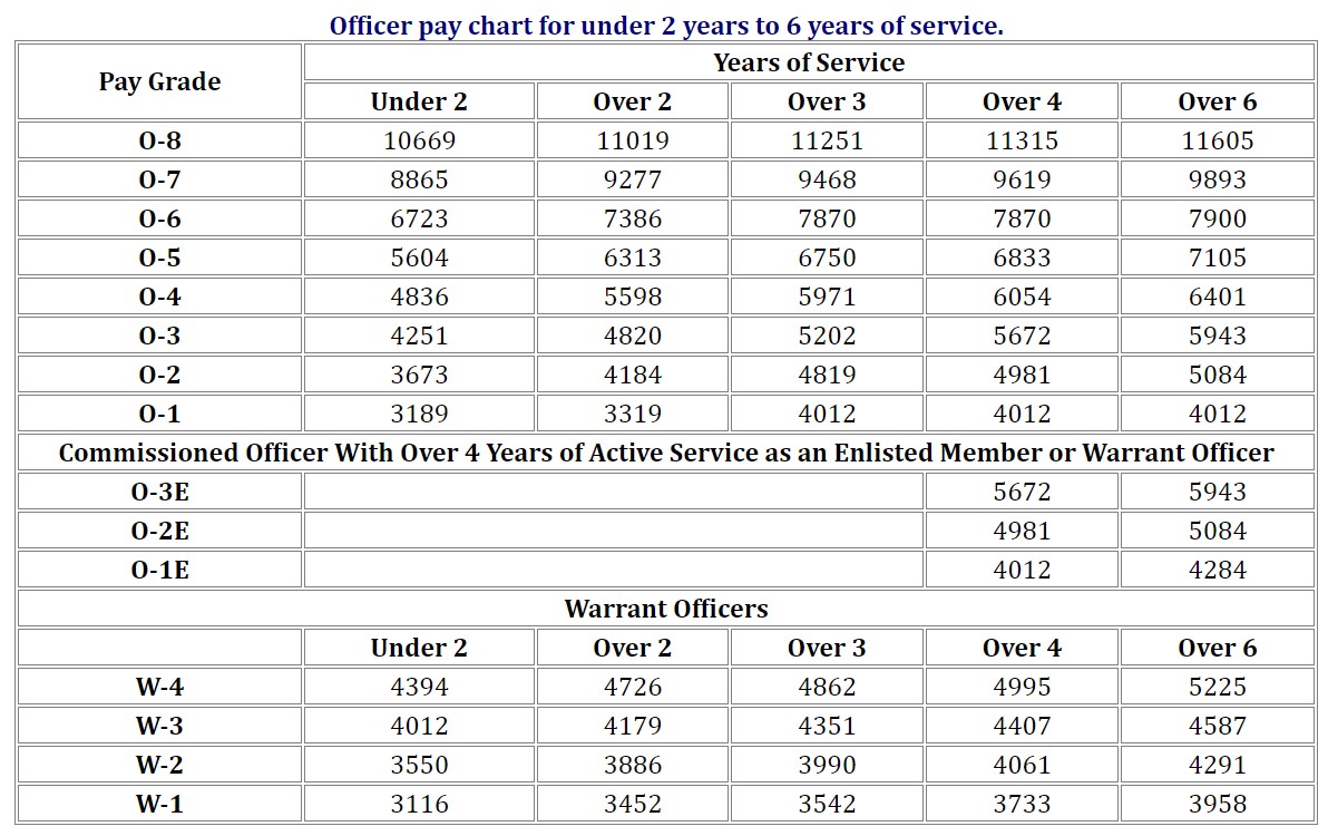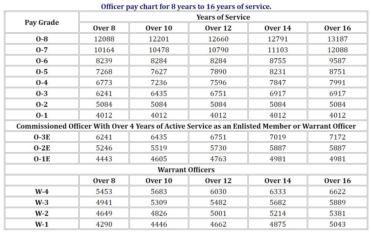 軍齡8-16年的軍官和准尉,繼續有O1E到O-3E的加薪