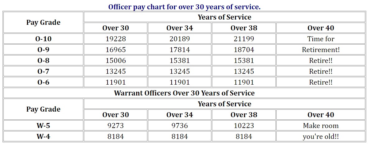 軍齡30年以上的軍官和准尉。O-1到O-5、W-1到W-3都必須在30年時退役。軍齡30年以上後,4年加一次薪。沒有特殊理由,40年必須退役了。也差不多,該60出頭了。