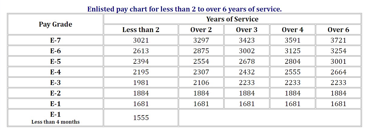 軍齡2年以下到6年的軍官和准尉,O-1到O-3如果在成為軍官以前有4年以上士兵軍齡,按照O-1E到O-3E計算。O-4以上不再區分。