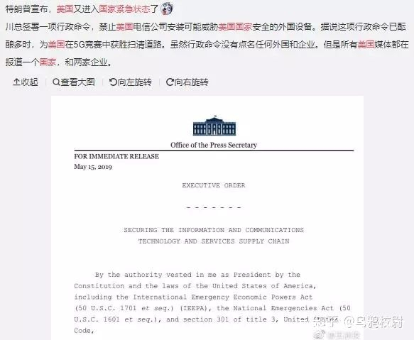 今天,特朗普針對華為簽了一項行政命令,要讓美國進入“國家緊急狀態”,禁止美國電信公司安裝可能威脅美國安全的外國設備,為美國在5G上的競賽獲勝掃清道路,這裏的“外國設備”,。當然指的就是華為的5G設備了